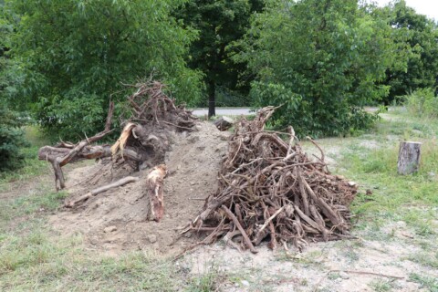 In drei Schritten wurden ca. 1400 m² der Rasenfläche entfernt und naturnah angelegt. Der Thymianrasen blieb unangetastet und 500 m² des Rasens rund um die Bäume blieb ebenfalls erhalten. Er wird jedoch nur noch 2 – 3 mal pro Jahr gemäht. Um unsere Projekte besser zu kommunizieren, teilen wir sie wenn notwendig bzw. möglich in Teilschritte auf, die jeweils einen Namen bekommen. Damit schaffen wir einen gewissen Wiedererkennungswert und fördern das Interesse – was steckt dahinter. Beim dargestellten Projekt wurde im ersten Schritt im Jahr 2023 auf ca. 500 m² eine Magerwiese geschaffen, die gestalterisch durch eine Hügellandschaft mit “Sandarium“ ergänzt wurde. Für den Hügel wurde das abgetragene Bodenmaterial der Rasenfläche verwendet und zusätzlich mit Schotter und Sand bedeckt. Der Hügel wurde teils mit Wildstauden bepflanzt, die Magerwiese stammt aus heimischem Saatgut. Im zweiten Schritt wurde Ende 2023/Anfang 2024 in direkter Nachbarschaft ein Vulkankegel errichtet, in dessen Zentrum ein kleiner, jedoch nicht dauerhaft gefüllter Teich mit Folie angelegt wurde. Aus dem Aushub entstand die Kraterwand mit einer Ausflussöffnung über die der mit Schotter belegte Teich sichtbar wird. Die umliegende Fläche wurde auf ca. 400 m² ebenfalls mager ausgebaut. Zwischen Krater und Baumreihe entlang der Straße wurde eine Gehölzsammlung als “Grüne Hölle“ gepflanzt. Hier wurde bereits Grünschnitt abgelagert, so dass er nicht extern entsorgt werden muss. Durch die Gehölze wird die “Grüne Hölle“ vom Rest der Magerwiese abgetrennt. Auch hier wurden heimische Stauden und heimische Saatgutmischungen verwendet. In einem dritten Schritt wurde im Jahr 2025 zwischen Vulkankegel und Thymianrasen auf ca. 500 m², nach dem Abtrag der umliegenden Grasnarbe, eine Käferburg als zentrales Element errichtet und die restliche Fläche mager ausgebaut. Die Käferburg besteht aus vielen Totholzelementen in unterschiedlicher Lage, im und über dem Boden eingebaut. Das ausgehobene Loch wurde mit Stroh und gehäckseltem Gehölzschnitt von anderen Grünflächen aufgefüllt. Zum Einsatz kam zusätzlich Schotter, Kies und Sand aus eigenen Baustellen (Bau von Gruben und Austrag von Bodenmaterial), die nicht extern entsorgt werden mussten. Als Abgrenzung zwischen Käferburg und Straße wurde mit zwei Wurzelstöcken von Robinien, die im Rahmen von Baumaßnahmen gefällt werden mussten, ein “Wurzelstockwall“ errichtet. Dieser besteht aus den besagten Wurzelstöcken, zwei größeren Stammteilen und weiteren Ästen, die mit Sand aus eigenen Baustellen angefüllt wurden und im Herbst bepflanzt werden. Grundsätzlich stammen sämtliche Materialien entweder vom Werksgelände bzw. aus dem näheren Umfeld, z.B. das Totholz teils von den zwei eigenen, gefällten Robinien bzw. Laubbäumen aus dem Rastatter Forst (angemodertes Holz aus dem Vorjahr, nach PEFC und FSC zertifiziert) und der Schotter/Sand der Bauabschnitte eins und zwei aus umliegenden Kiesgruben bzw. Steinbrüchen. Wie bei den beiden seit 1 – 2 Jahren blühenden ersten Teilflächen wurde auch bei der Käferburg auf heimisches Saatgut (Rieger-Hofmann Mischungen Blumenwiese, Schmetterlings- und Wildbienensaum, Sandmagerrasen und Verkehrsbegleitgrün) und heimische Wildstauden gesetzt. Die beiliegende NaturaDB Pflanzenliste umfasst alle drei beschriebenen Teilflächen.