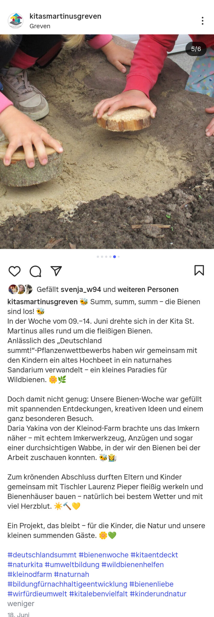 Gemeinsam mit unseren Kita-Kindern möchten wir unseren Innenhof etwas schöner gestalten. – Bedeutet, dass wir neben unserem Apfelbaum und Erdbeerpflanzen ein Hochbeet als Sandarium umfunktionieren, um unter anderem den Bienen einen neuen geschützten Ort bieten zu können.