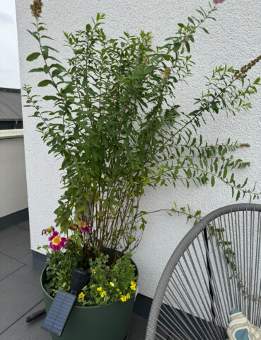 In diesem Jahr bzw. im Herbst 2024 haben wir nach den Erfahrungen der ersten zwei Jahre hier gezielt neue Kübel und Pflanzen (neu und alte umgestellt bzw. die Gruppierungen besser arrangiert) an neuen Standorten gestellt. Aber es sind auch 10 neue Kübel und ein großes Hochbeet auf der Dachterrasse eingezogen, um u.a. auch einen natürlichen Sonnenschutz mit Kletterrosen für die Loungesofaecke aufzubauen.