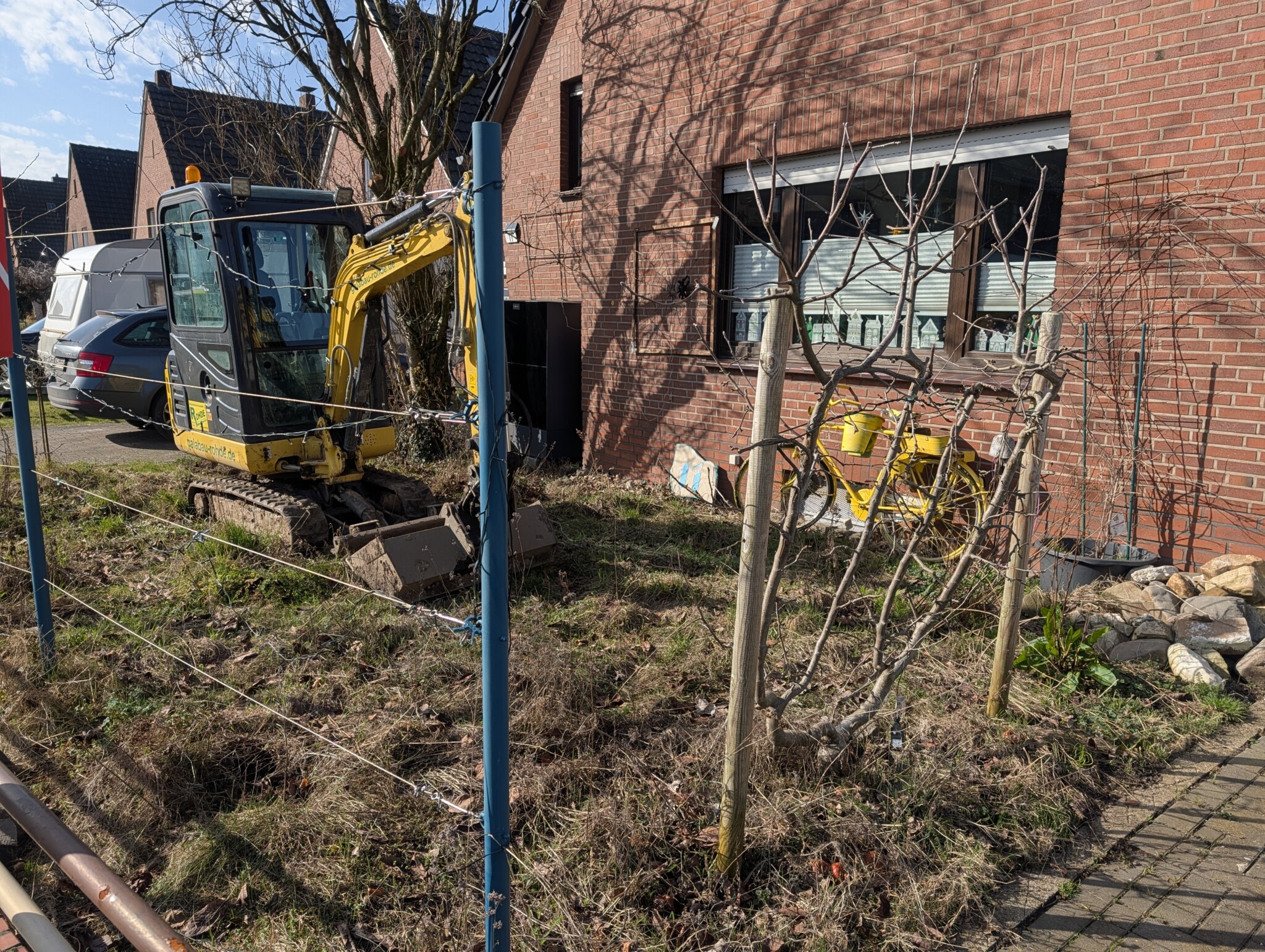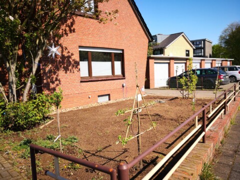 2019 folgte der erste Schritt zur Veränderung: Die Thuja-Hecke wurde entfernt und durch Spalierobst entlang der Grundstücksgrenze ersetzt. Der Rasen wich einer Wildblumenwiese mit heimischen Arten, um den Garten ökologisch aufzuwerten.