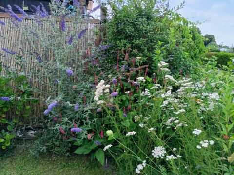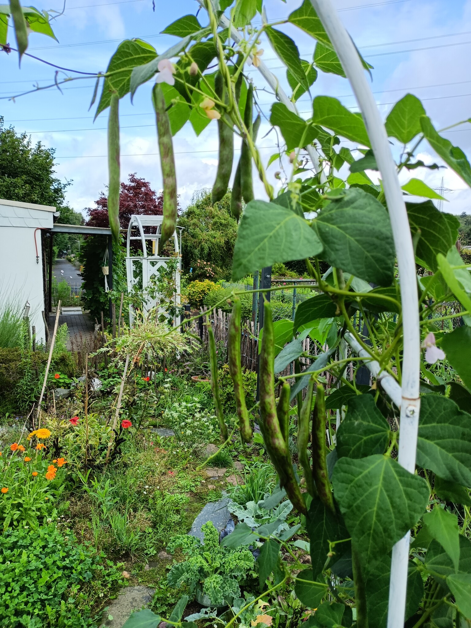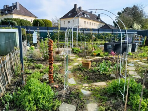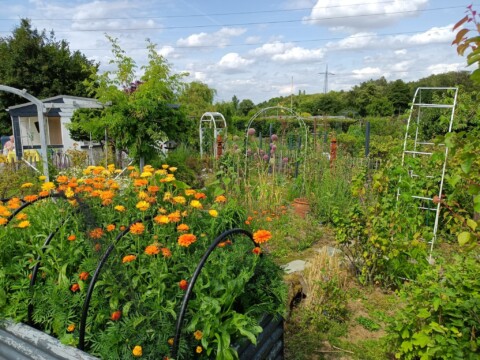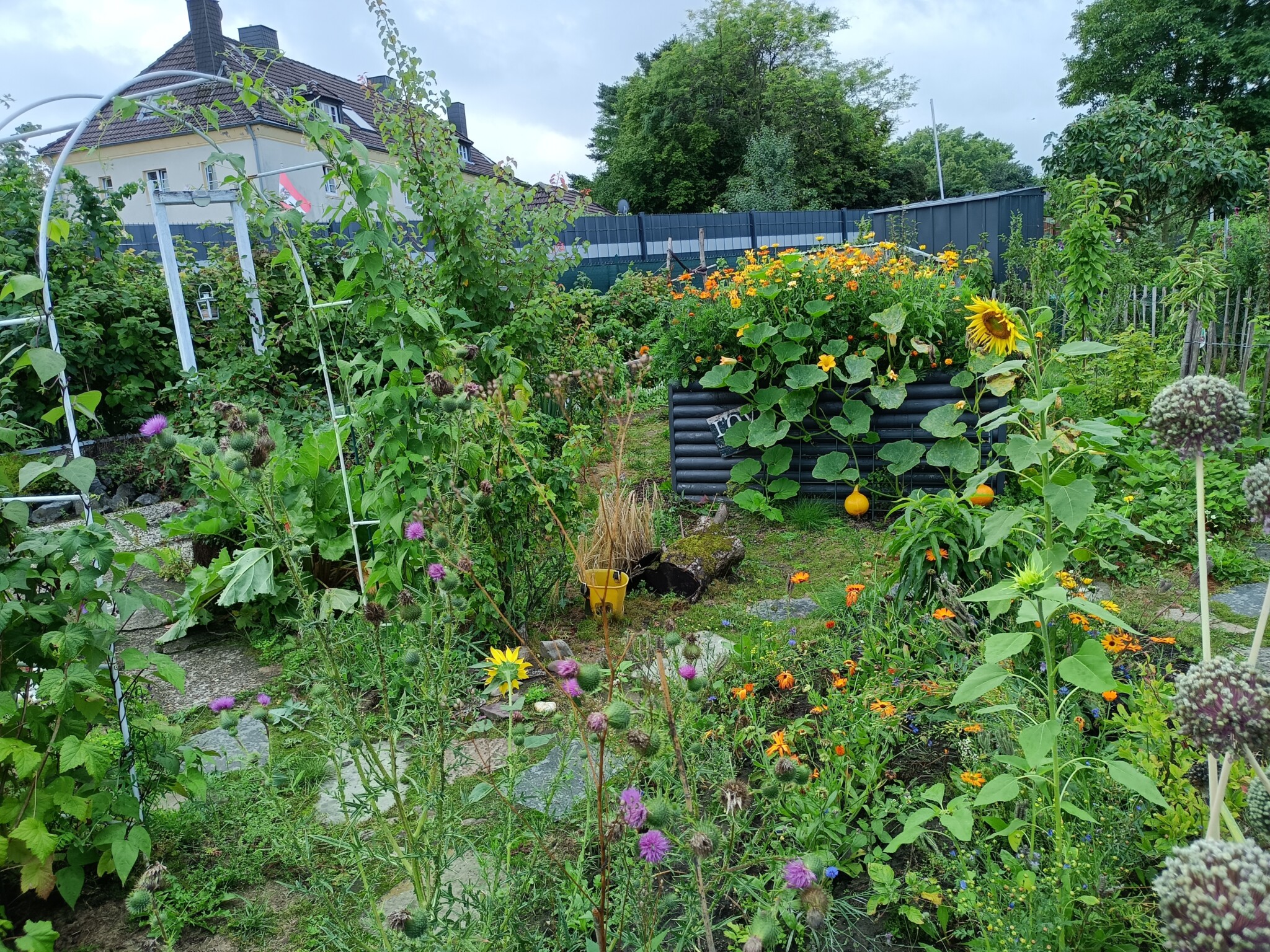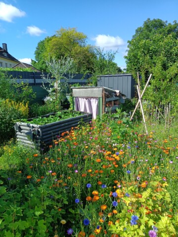 Seit dem Anfangsjahr Januar 2023 haben wir einige Wildpflanzen angepflanzt wie Holunder, Faulbaum. Wildrosen, Eberesche, Weißdorn, Felsenbirne und zusätzlich versuchen wir durch die Aussaat von Wildblumenmischungen (Ringelblume, Kornblume, Kornrade, Weißklee, Rotklee, Nachtkerzen, wilde Karde, Baldrian …) und durch die Förderung von angeflogenen Wildkräutern (Natternkopf, Wasserdost, Eselsdistel …) ein nektar- und pollenreiches Angebot für blütenbesuchende Insekten zu schaffen. Neben den Wildpflanzen sind noch Tafelobst wie Süßkirschen, Birnen, Nashi-Birnen, Pflaumen, ein Apfel und eine Aprikose, eine Feige und zahlreiche Beerensträucher wie schwarze und rote Johannisbeeren, Erdbeeren, Stachelbeeren, Weintrauben, Heidelbeeren, Aroniabeeren, Brombeeren, Himbeeren, Jostabeeren, eine kleine Kiwi und Kräuter wie Pfefferminzen, Bohnenkraut, Salbei, Schnittlauch, Waldmeister, Thymian und Oregano angepflanzt.