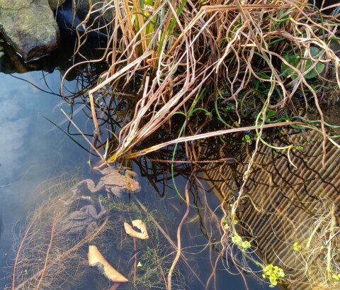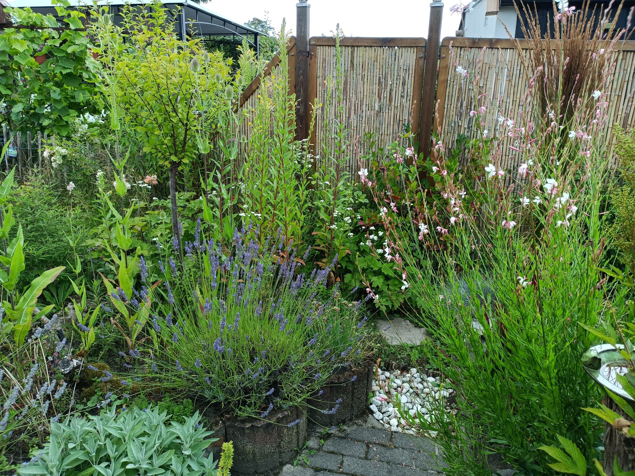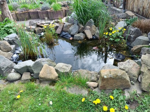 Einen kleinen Teich umgeben von Steinhaufen, Mädesüß, Prachtkerze (Gaura), Gräsern und Rasen haben sich die Kreuzkröten als Refugium ausgesucht. Im Frühjahr laichen auch die Erdkröten in dem Gewässer.