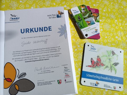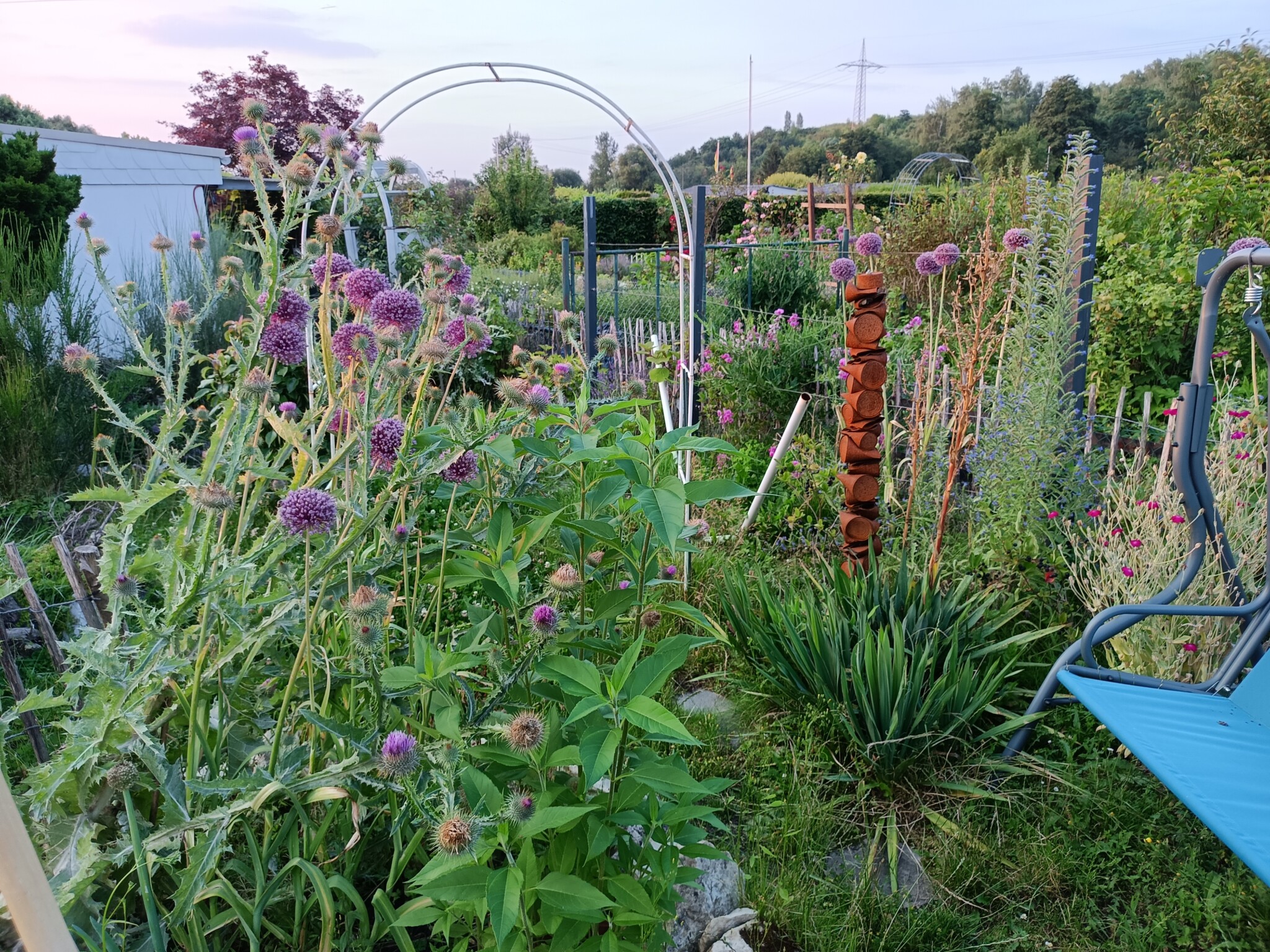 In der Nähe des kleinen Teichs soll als nächstes Projekt noch ein Steinhaufen-Sandarium mit kleinen Höhlen entstehen, tiefgegründet in der Erde als Biotopstruktur für weitere Gäste, die sich bei uns ansiedeln möchten. In letztem Sommer (Jahr 2025) hat sich wieder ein großes Blütenmeer entwickelt, das unzähligen Insekten und Schmetterlingen Nektar und Pollen zur Verfügung stellte. Als besonderer Gast war die Schmetterlingsart Schwalbenschwanz zu beobachten neben Weißlingen, Tagpfauenaugen, Zitronenfaltern und Faulbaum-Bläulingen.