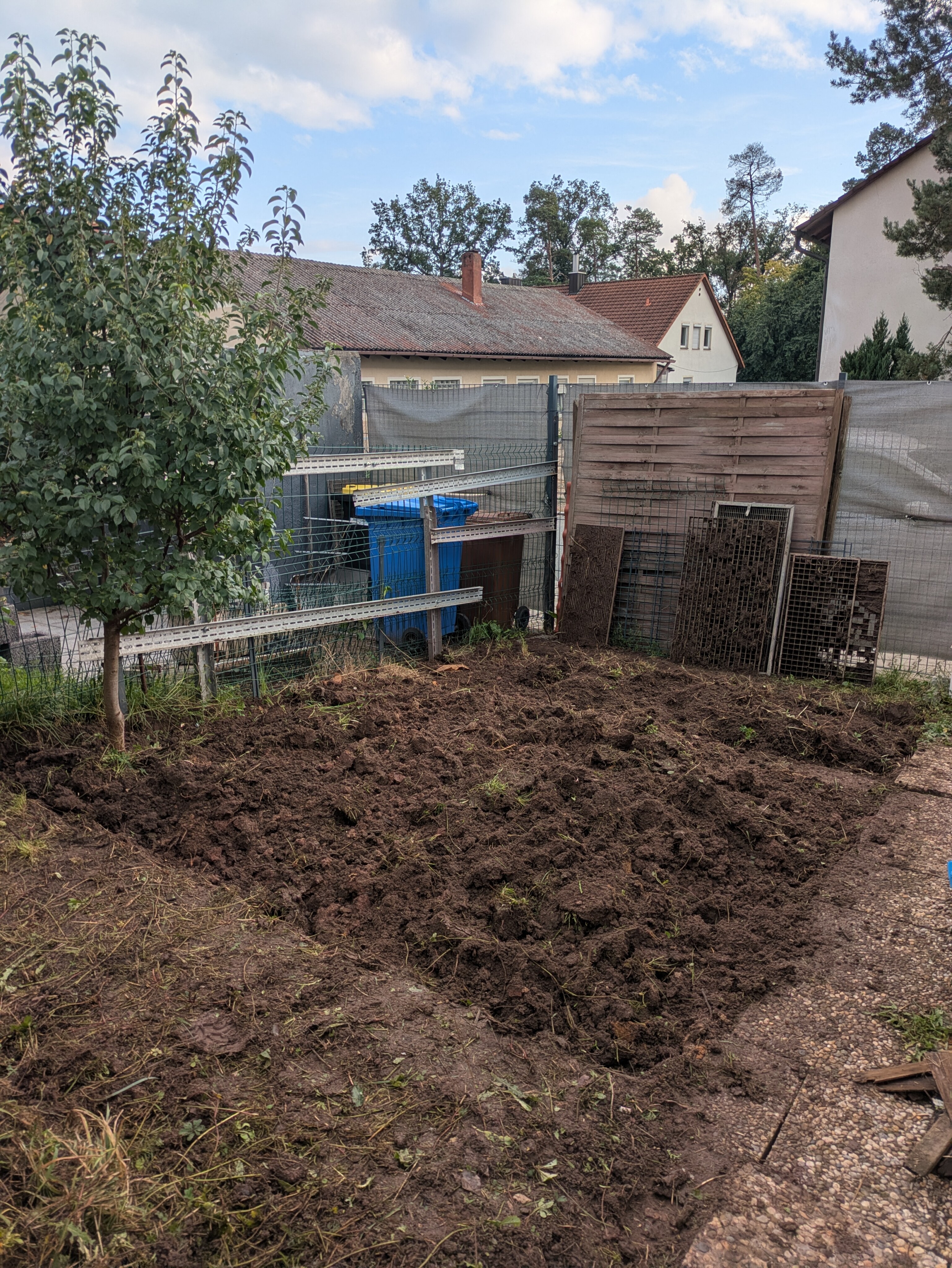 Im Herbst 2025 wurde eine Wohnimmobilie mit kleinem Garten in einem Industriegebiet übernommen. Neben einer bereits vorhandenen Terasse bestanden zwei kleine ungepflegte Grünflächen. Eine davon bleibt als Kinder-Spielfläche erhalten. Ein Bereich von 16qm wurde komplet auf links gedreht. Die vorhandenen Vegatation aus wucherndem Fingerkraut und Kriech-Queken wurde entfernt, der Boden mit Sand abgemagert und verschiedene Elemente eines Naturgartens umgesetzt.